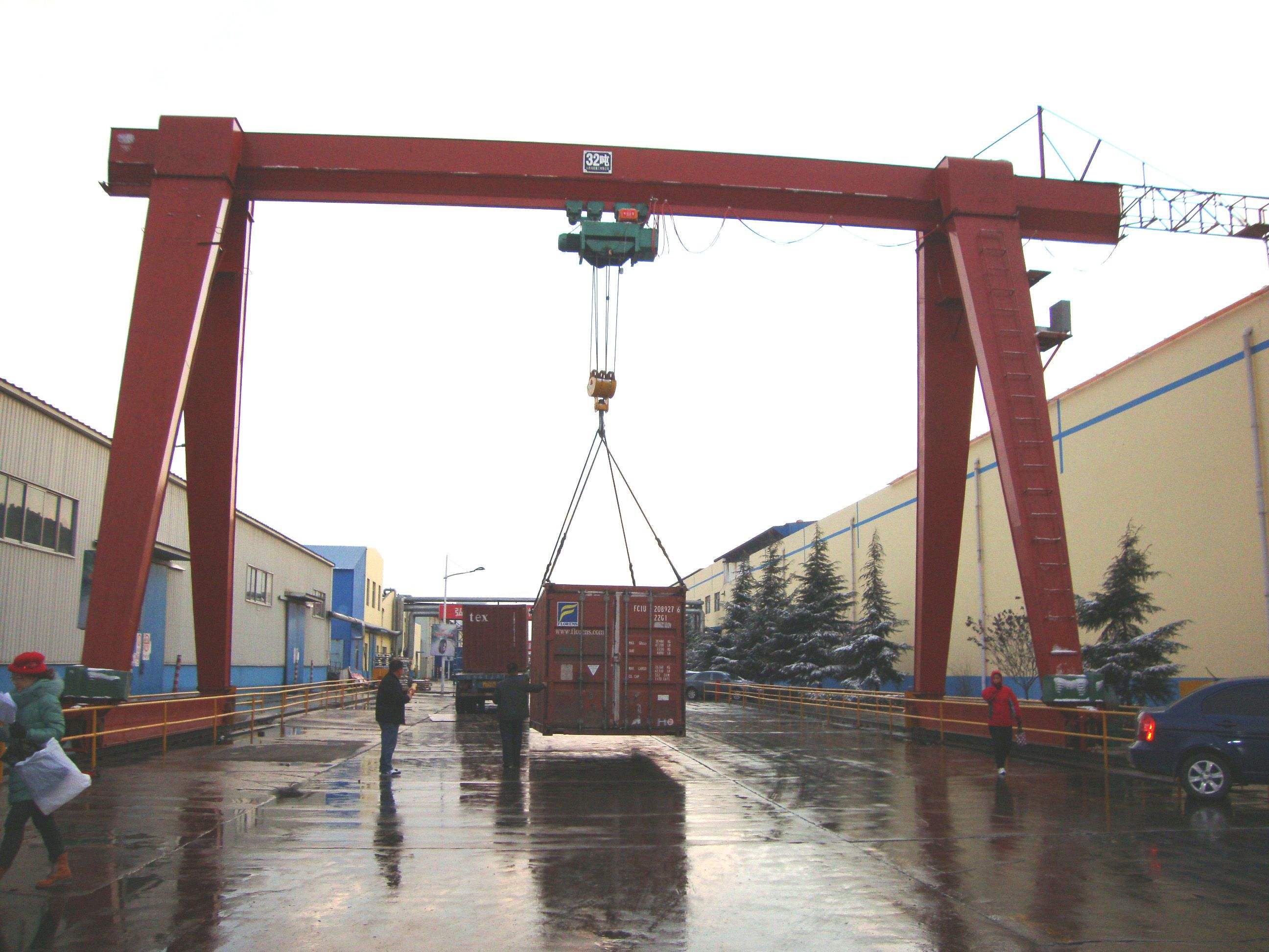 門式起重機是橋式起重機的一種變形,又叫龍門吊。主要用于室外的貨場、料場貨、散貨的裝卸作業。它的金屬結構像門形框架,承載主梁下安裝兩條支腳,可以直接在地面的軌道上行走,主梁兩端可以具有外伸懸臂梁。門式起重機具有場地利用率高、作業范圍大、適應面廣、通用性強等特點,在港口貨場得到廣泛使用。