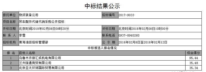 青海油田吊車配件代儲代銷采購中標候選人公告