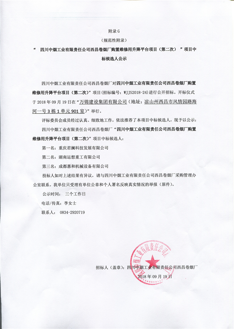 四川中煙工業有限責任公司西昌卷煙廠“四川中煙工業有限責任公司西昌卷煙廠購置維修用升降平臺項目(第二次)”項目中標候選人: