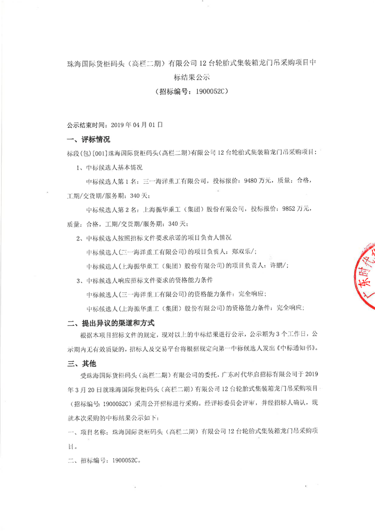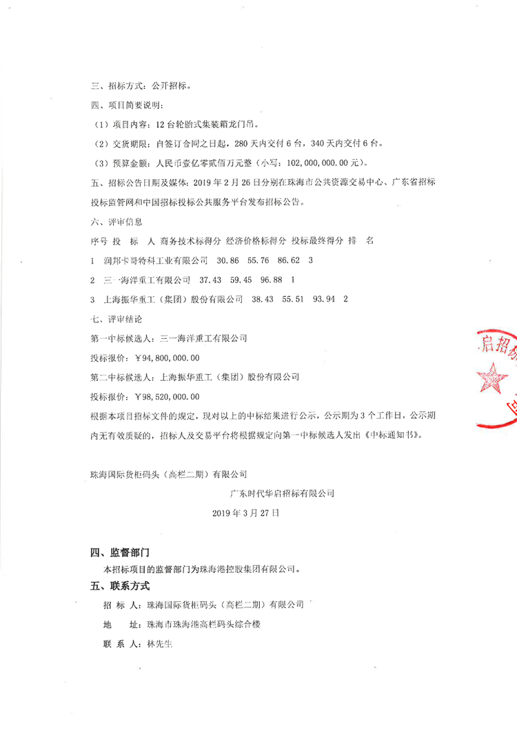 珠海國際貨柜碼頭(高欄二期)有限公司12臺輪胎式集裝箱龍門吊采購項目中標結果公示