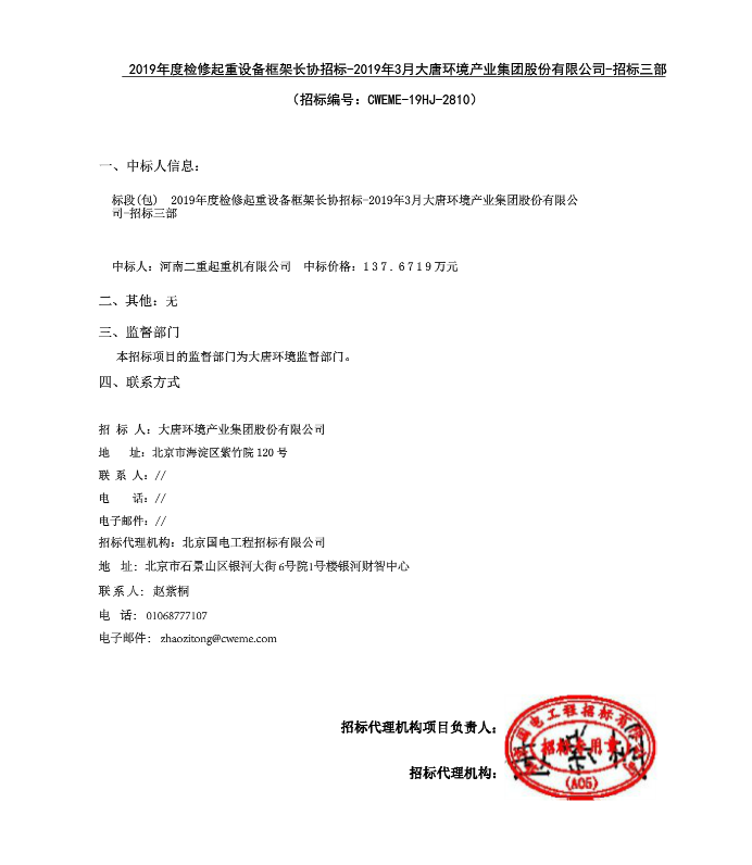 2019年度檢修起重設備框架長協招標-2019年3月大唐環境產業集團股份有限公司-招標三部中標結果公示