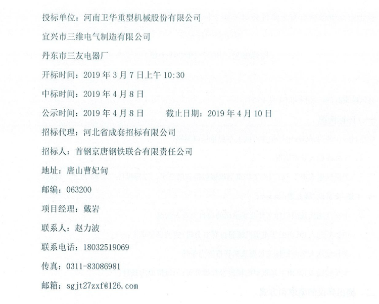 移動版:首鋼京唐鋼鐵聯合有限責任公司二期工程項目4300mm中厚板生產線天車起重量限制器中標公示