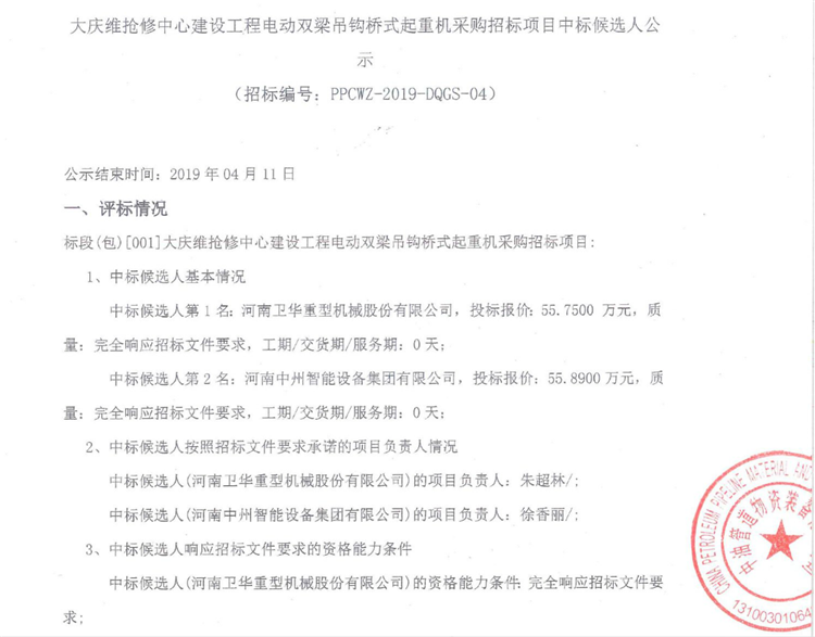 大慶維搶修中心建設工程電動雙梁吊鉤橋式起重機采購招標項目中標候選人公示