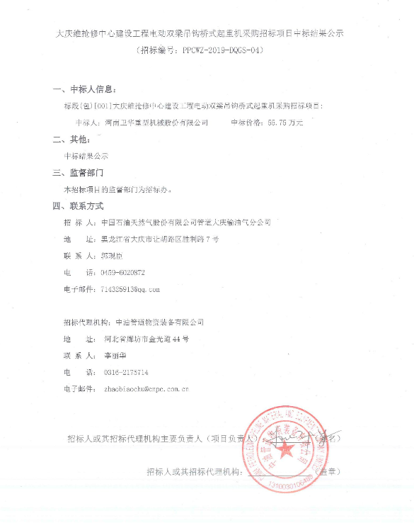 大慶維搶修中心建設工程電動雙梁吊鉤橋式起重機采購招標項目中標結果公示