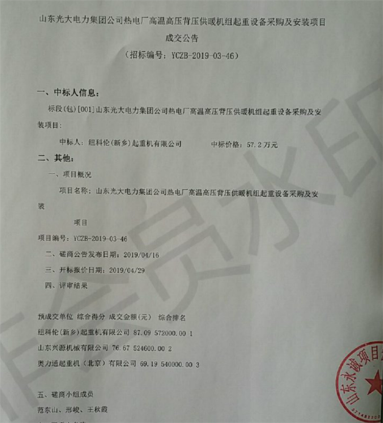 移動版:山東光大電力集團公司熱電廠高溫高壓背壓供暖機組起重設備采購及安裝項目成交公告