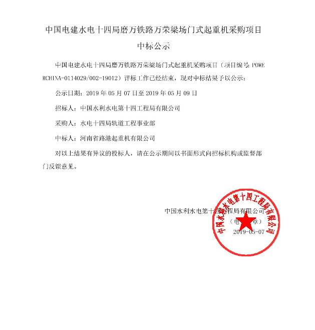 移動版:中國電建水電十四局磨萬鐵路萬榮梁場門式起重機采購項目中標公示