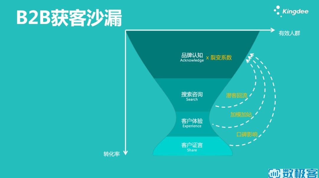 而當我往里面加入裂變系數時,會發現在這個因素的影響下,底下的搜索咨詢、客戶體驗和客戶證言會形成一個回流,最終使品牌認知變得更加巨大,實現一個良好的獲客循環。