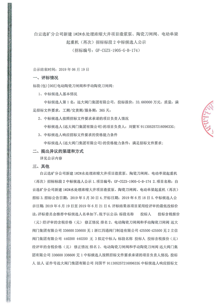移動版:白云選礦分公司新建1#2#水處理濃縮大井項目渣漿泵、陶瓷刀閘閥、電動單梁起重機(再次)招標標段2中標候選人公示
