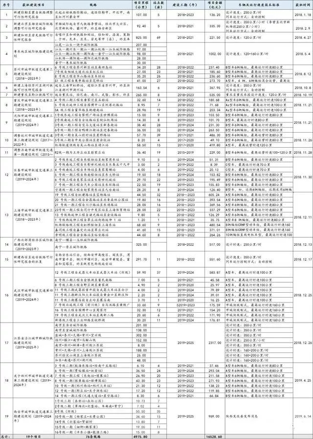自2018年1月1日至2019年6月20日,軌道交通項目建設共計19個,涉及76條線路,項目里程達4975.80公里,投資金額達16528.60億元