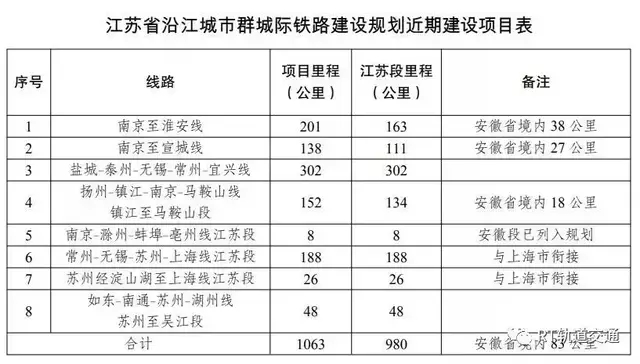江蘇省沿江城市群城際鐵路建設規劃(2019-2025年),按照網絡布局,有序建設一批城際鐵路項目。近期規劃建設南京至淮安、南京至宣城等城際鐵路項目,其中江蘇省內總里程約980公里。近期建設項目江蘇段投資約2180億元。