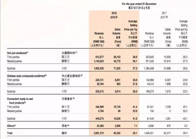 頤海國際是一家主營火鍋底料和火鍋調味料的企業,公司前身是專門為海底撈門店提供火鍋底料的集團子公司,2013年拆分獨立,2016年香港上市。公司目前收入分為兩大塊:2B和2C業務,兩者各占50%,其中2B主要是與關聯方海底撈合作,2C業務主要以“海底撈”品牌銷售火鍋底料和蘸料、中式復合調味料和自熱小火鍋等產品。從其公布的2018年報來看,火鍋料是其核心業務,占收入比72.9%。
