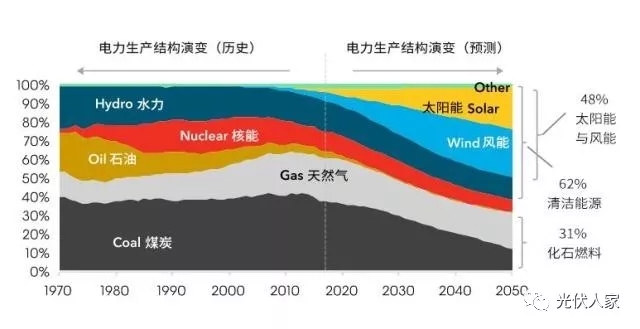 根據BNEF對綜合技術發展趨勢和能源成本的分析,到2050年,煤電在全球能源中的占比將從目前的37%下降至12%,而石油將基本消失。風能和光能則會從目前的7%上升至2050年的48%,水力、天然氣、核能占比則在1%上下浮動。