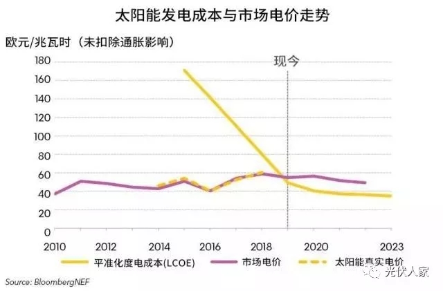 圖中黃色實線為LCOE(平準化度電成本,Levelized Cost of Energy),是國際上通用的評價度電成本的指標。紅色實線為市場電力價格。