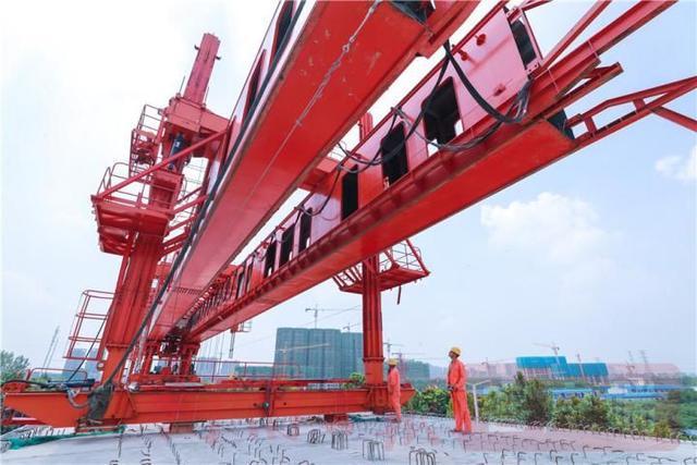 7月13日,中鐵十六局鄭許市域鐵路施工現場,工人正在進行架梁作業。鄭許市域鐵路工程全長約59公里,連接了新鄭國際機場換乘中心和許昌東站,計劃于2020年年底試運營。