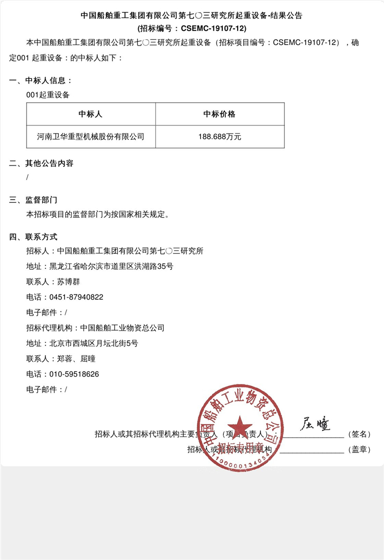 中國船舶重工集團有限公司第七〇三研究所起重設備-結果公告