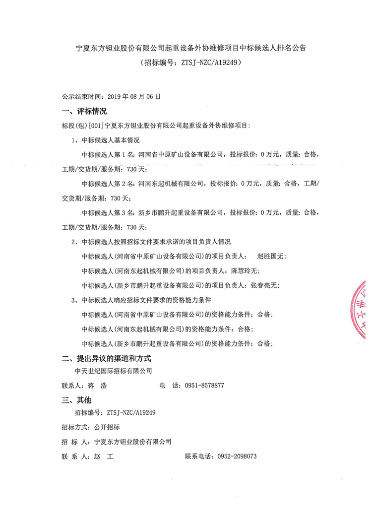 寧夏東方鉭業股份有限公司起重設備外協維修項目中標候選人排名公告