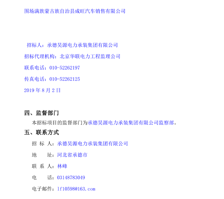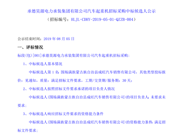 承德昊源電力承裝集團有限公司汽車起重機招標采購中標候選人公示