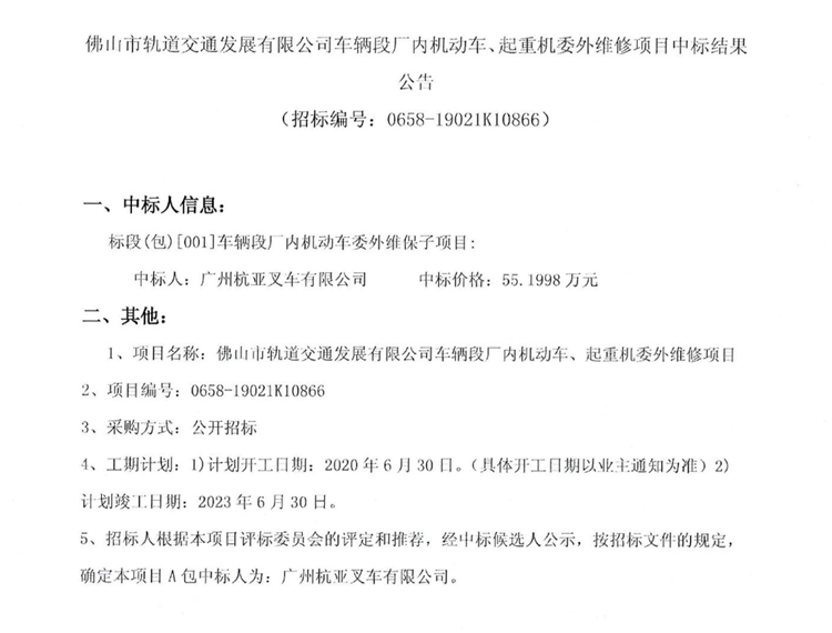 移動版:佛山市軌道交通發展有限公司車輛段廠內機動車、起重機委外維修項目中標結果公告