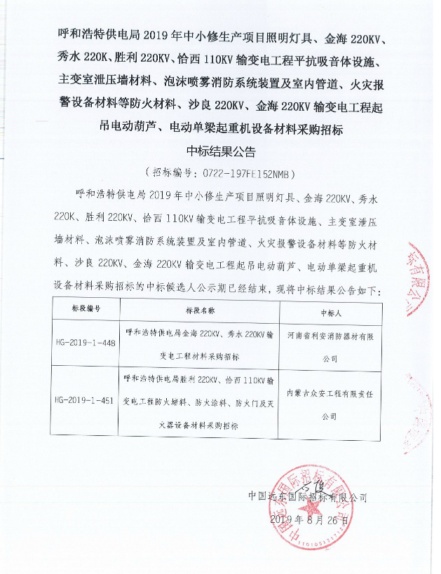 【呼和浩特供電局2019年中小修生產項目照明燈具、金海220KV、秀水220K、勝利220KV、恰西110KV輸變電工程平抗吸音體設施、主變室泄壓墻材料、泡沫噴霧消防系統裝置及室內管道、火災報警設備材料等防火材料、沙良220KV、金海220KV輸變電工程起吊電動葫蘆、電動單梁起重機設備材料采購招標】中標結果公告