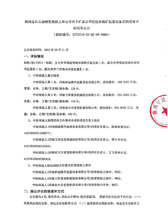 陜西延長石油物資集團上海公司關于礦業公司巴拉素煤礦起重設備采購項目評標結果公示