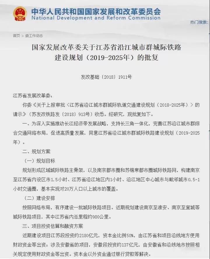 此外,在《江蘇省沿江城市群城際鐵路建設規劃(2019-2025年)》中,8條城際鐵路正式獲批!