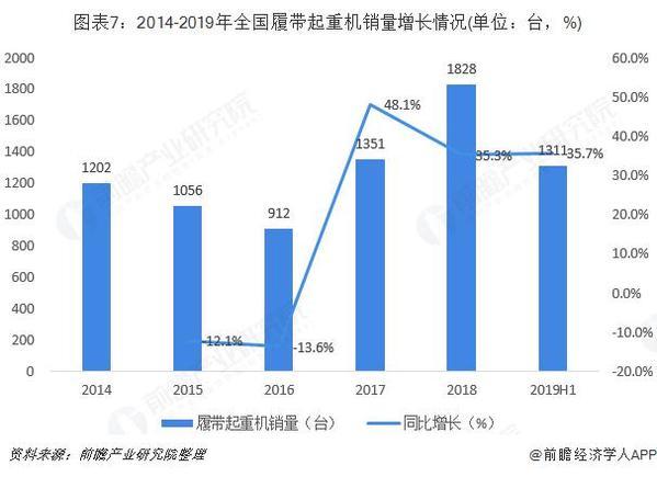 近年來我國履帶式起重機銷量波動上升,2015-2016年連年下降,2016年跌至近年谷底,銷量不足1000臺,自2017年開始大幅度增長,2018年中國履帶起重機銷量達到1828臺,同比增長35.3%。截至2019年上半年,中國履帶起重機累計銷量達到1311臺,同比增長35.7%。