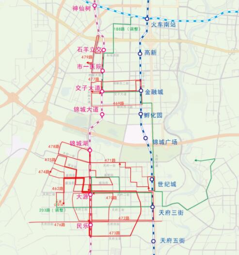 ③錦城湖站:新開471路(地鐵錦城湖站—地鐵世紀城站)銜接地鐵1號線,新開478路(地鐵錦城湖站—地鐵錦城湖站)覆蓋劍南大道西側居住區。