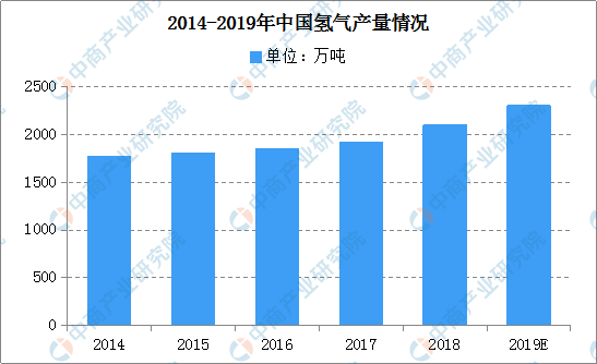 氫能源是目前已知的所有能源中最為清潔的一種,被稱為最理想的新能源。近年來,我國氫氣年產量已逾千萬噸規模,位居世界第一大產氫國;金屬儲氫材料產銷量超過日本,成為世界最大儲氫材料產銷國。數據顯示,2014-2018年我國氫氣產量呈逐年遞增趨勢,其中2018年中國氫氣產量約為2100萬噸。另外,據畢馬威預測,2019年我國氫氣產量或突破2000萬噸,成為世界第一產氫大國。未來,我國氫能產量也將維持增長趨勢。