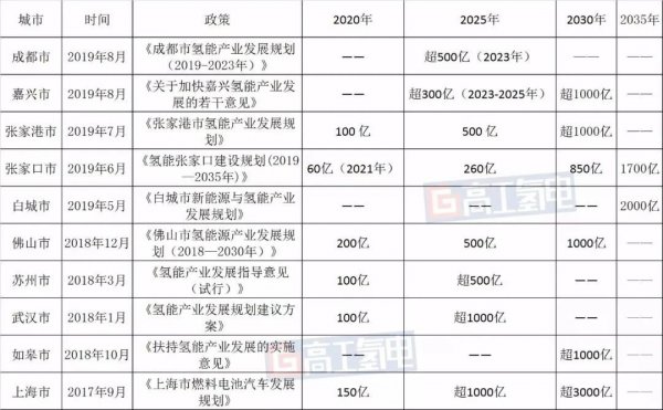 據高工氫電統計,截止到去年下半年,全國已經有佛山、深圳、茂名、成都、北京、株洲等30個多城市發布相關的氫能規劃路線圖。除白城市之外,還有成都市、上海市、如皋市、嘉興市、蘇州市、武漢市、張家口市、佛山市、張家港市等城市在規劃中明確了到2020年、2025年、2030、2035年氫能產業年產值目標,詳見下表: