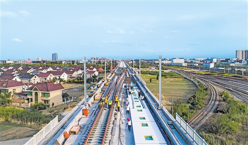 6月11日,鹽通高鐵施工人員在江蘇海安段進行無砟軌道施工。