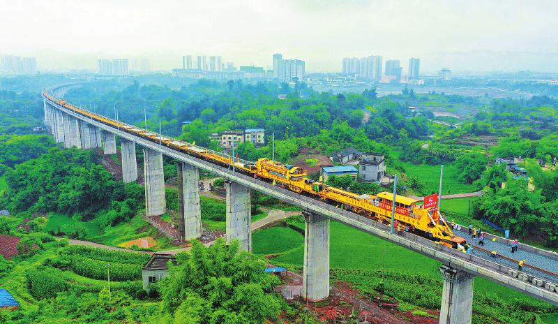 6月12日,川南城際鐵路正式開始鋪軌。這是國內目前最先進的鋪軌機組在橋上鋪軌。記者何海洋攝