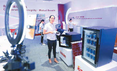 6月15日,為期10天的第127屆廣交會在網上開幕,這是中國首次完全以網絡形式舉辦的廣交會。廣交會按16大類商品設置50個展區,全部免收參展費用,幫助企業減負紓困,開拓國際市場。圖為6月15日,位于山東省青島市的青島營上電器有限公司,營銷人員通過廣交會直播平臺推介出口到非洲等海外市場的冰箱產品。梁孝鵬攝(人民視覺)