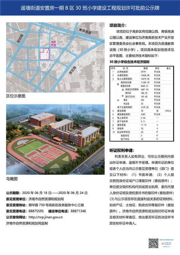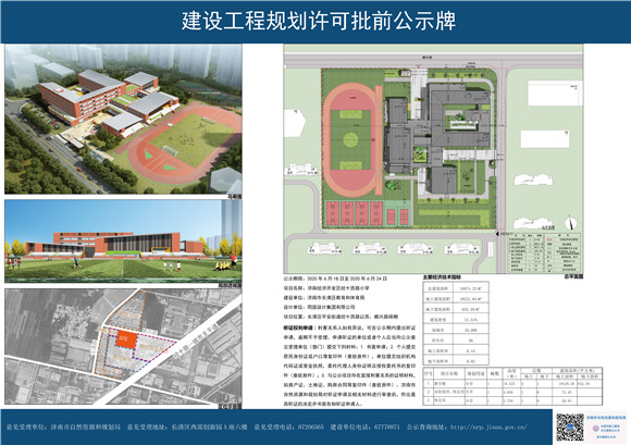 遙墻街道安置房一期B區30班小學建設工程規劃許可也進行了批前公示。項目位于高新區荷花路以西、青銀高速公路以南,建設單位為濟南高新技術產業開發區管理委員會社會事務局。項目為普通教育設施30班小學。學??傆玫孛娣e29791㎡,總建筑面積19608.88㎡,配有4層教學綜合樓、配套綜合樓、多功能教室、室外衛生間、活動場地、看臺、傳達室等,50個機動車停車位。