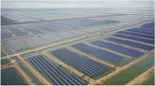 總投資15.24億元、占地7800余畝的濱州市沾化區濱海鎮通匯“漁光一體”現代產業園,采用漁光一體模式進行綜合開發,將光伏電站與養殖業相結合,在蝦池上建設光伏電站,形成“上可發電,下可養殖”的發電模式,將現代智慧農業、光伏產業進行科學、有機的結合,并適度疊加休閑觀光農業,打造集新漁業、新能源、新農村為一體的“三新”現代產業園,把不毛之地變成寸金寸土的寶地,實現了向鹽堿地要效益。該產業園是目前全國最大的單體“漁光一體”項目。 來源: 大眾日報