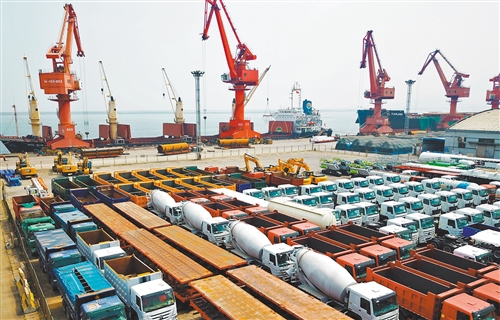 7月6日,一批車輛和工程機械設備在江蘇連云港港集結等待裝船出口海外。