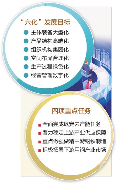 組織機構集團化。加快推動企業兼并重組,著力構建以世界級大型集團為引領、國內具有較強影響力集團為支撐、新優專特企業為補充的梯次發展格局。2020年底,產量排名前10家鋼鐵企業粗鋼產量占比達到60%,力爭到2022年底提高到65%,大型企業集團整合上下游鏈條能力明顯增強。