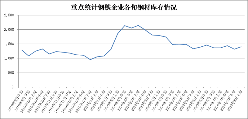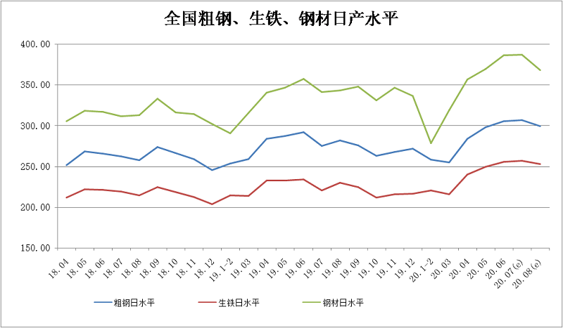 2020年8月上旬,重點統計鋼鐵企業共生產粗鋼2153.45萬噸、生鐵1917.04萬噸、鋼材1998.98萬噸、焦炭323.76萬噸。本旬平均日產,粗鋼215.34萬噸,環比減少0.87%、同比增長5.14%;生鐵191.70萬噸,環比減少0.66%、同比增長5.39%;鋼材199.90萬噸,環比減少8.30%、同比增長4.95%。