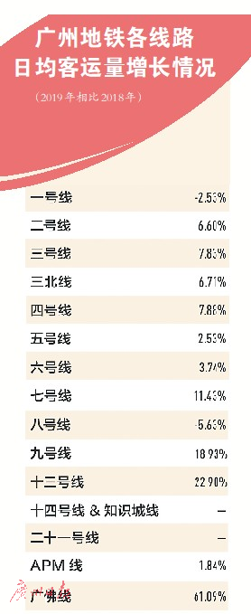 二號線、三號線(含北延段)是廣州地鐵客流量最大的兩條線路,而且呈持續上升趨勢。2019年廣州地鐵年報顯示,二號線去年日均客流量為143.49萬人次,同比增長6.60%;三號線131.80萬人次,同比增長7.83%;三號線北延段87.14萬人次,同比增長6.71%。