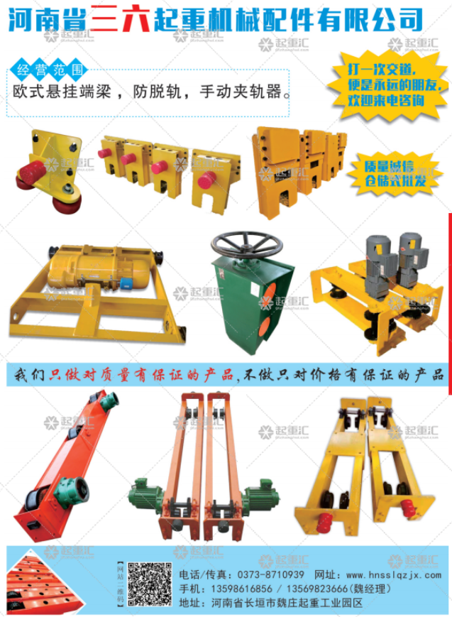 河南省三六起重機械配件有限公司已加入《起重匯采購指南》專業生產:歐式懸掛端梁,防脫軌,手動夾軌器,咨詢電話:13598616856