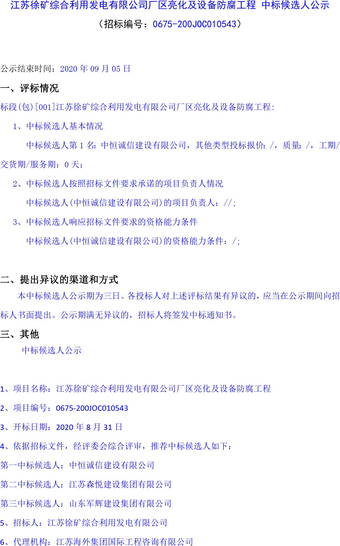 移動版:江蘇徐礦綜合利用發電有限公司廠區亮化及設備防腐工程中標候選人公示