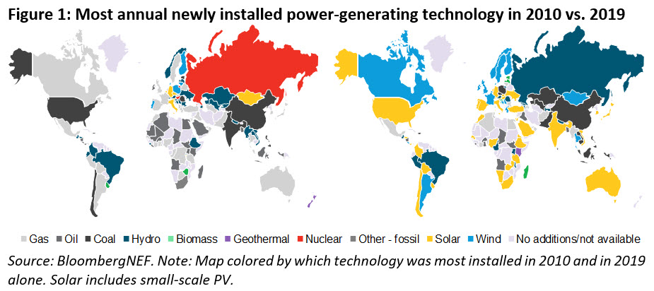 總體而言,2019年,太陽能和風能裝機容量占2019年全球265吉瓦增量的三分之二以上,遠高于2010年的不到四分之一這一比例。這兩種技術也首次占新增裝機容量的大部分。如果包括水力發電在內,那么可再生能源占2019年投產容量的四分之三。