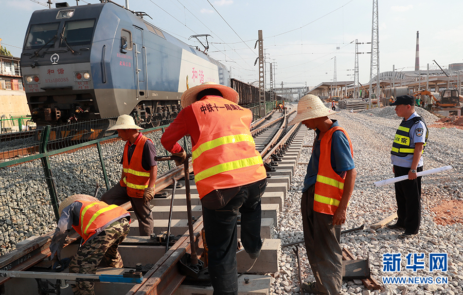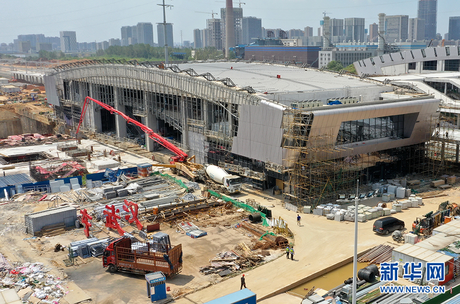 武漢東站主體工程近日已基本完成,千余名建設者冒著高溫抓緊進行鋪軌、電氣化設施安裝、站房裝飾裝修等施工,計劃年底通車。