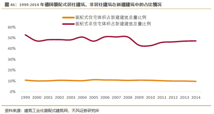 由于預制混凝土大板技術造價高,建筑缺少個性,難以滿足今天的社會審美要求,1990年以后很少再使用。目前,德國的公共建筑、商業建筑、集合住宅項目大都因地制宜、根據項目特點,選擇現澆與預制構件混合建造體系或鋼混結構體系建設實施。裝配式建筑是指建造中采用了大型預制構件的建筑,對裝配率沒有硬性規定。根據德國聯邦統計局數據,1999-2014年,德國新建居住建筑中裝配式占比在9.5%-11%;非居住建筑中裝配式占比在42.7%-52.7%。