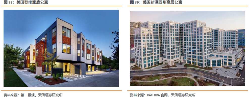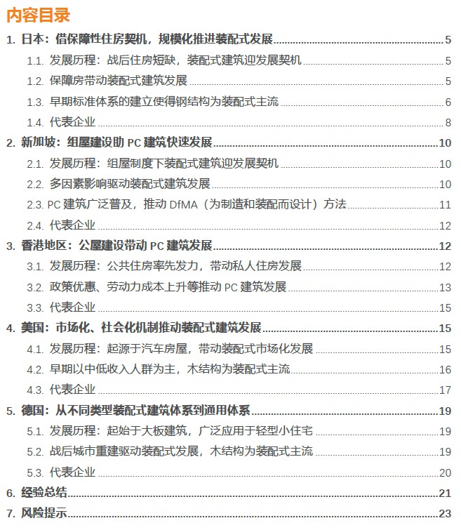 4)從結構體系看,發達經濟體依據各自國情地區等特點,出現差異化發展。日本、美國、德國實行土地私有制且大部分地區人口密度較低,且成本相比鋼結構、木結構更低,因此在建筑結構上更多地選擇低層建筑,多采用質量較輕、工期較短且建造更為方便的輕鋼結構住宅和木結構住宅。新加坡、香港地區實行土地公有制,且人口密度大,因此采用的是多高層PC建筑。