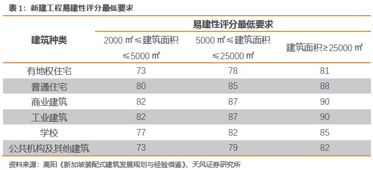 同時,2000年開始,新加坡政府決定以法規的方法對所有新的建筑項目實行“建筑物易建性評分”規范。易建性評分設計中主要規定了不同建筑物的易建性的最低計分要求以及送審程序和易建性計分方法。其目的是為了使建筑物相對容易施工,并且能減少工人的數目,提高生產效率。此外,該規范鼓勵使用預制浴室、預制廁所(如MIC廁所)等立體構件,這樣可以得到加分。分值越高,其易建性越強,建筑質量和勞動生產率也越高。
