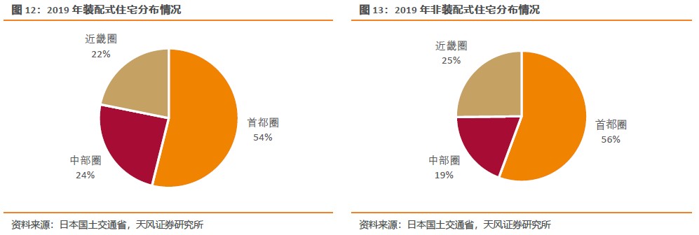 分地區來看,裝配式住宅和非裝配式住宅分布情況類似,集中分布在首都圈。2019年新建裝配式住宅中首都圈占比超一半,主要原因是以東京為首的大都市圈人口多,密度高,住房市場需求大,而偏遠地區人口分布較為稀疏,市場較小,難以形成較強的規模優勢。