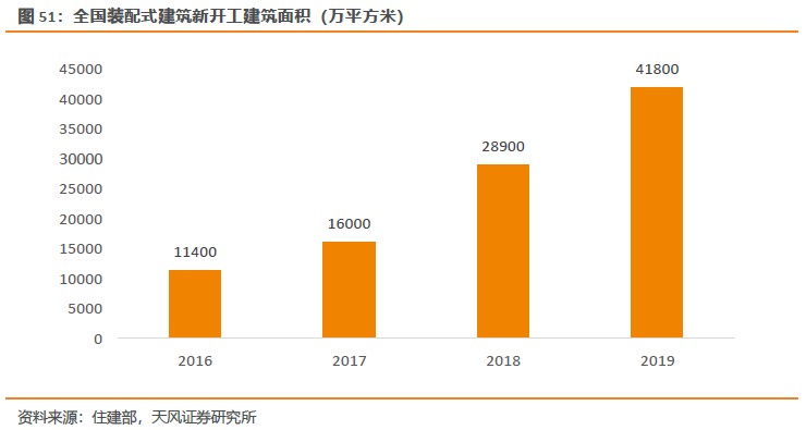 發展階段:隨著技術和體系的不斷完善,裝配式建筑也從適用階段邁向推廣階段。目前我國處于裝配式建筑的快速發展階段。根據住建部統計數據,2019年新開工裝配式建筑面積開達到4.2億平米,近4年復合增長率達到55%。2020年08月28日,住建部等部門聯合發布《關于加快新型建筑工業化發展的若干意見》,明確提出大力發展鋼結構建筑,并推廣裝配式混凝土建筑??梢娢覈鳳C結構已發展較為成熟,進入到推廣階段。我們認為伴隨國家政策的不斷加碼以及產業鏈的迅速崛起,在我國龐大的建筑市場下,裝配式建筑有望繼續加速發展。