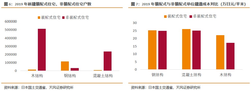 2019年非裝配式住宅中木結構、鋼筋混凝土結構、鋼結構占比分別為66%、30%、3%。木結構遠高于PC結構,主要原因有:1)日本的森林覆蓋率高達66.8%,日本民族自古就有喜愛木建筑的傳統;2)傳統木結構從外觀和功能來看相對簡陋,建造成本更低,較PC結構低32.7%;3)日本受多地震、多臺風等影響,加之傳統的居住習慣,住宅以低層獨棟住宅為主,多高層公寓為輔。木結構主要應用于低層獨棟住宅,鋼筋混凝土結構主要應用于多高層公寓。