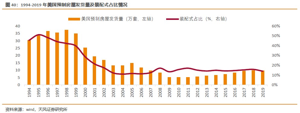 從過去近30年歷史來看,90年代美國預制房屋發貨量穩定在30萬套以上,裝配式占比在40-50%,1998年預制房屋發貨量達到37.31萬套,達到近30年最高值。隨后美國開始調結構,減少低端裝配式房屋占比,此后預制房屋發貨量和占比均呈下滑趨勢,到2019年美國預制房屋發貨量9.46萬套,裝配式占比為13.9%,主因前期低端裝配式住宅總量較多所致。