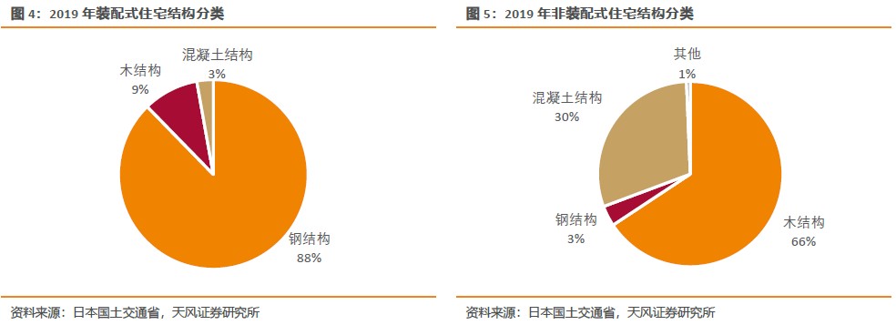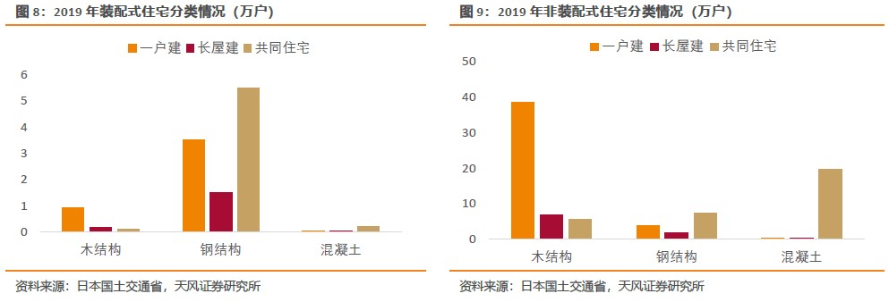住宅建筑方面,日本裝配式更多應用于共同住宅(公寓或高層住宅),一戶建(類似獨棟別墅)、長屋建(類似聯排房屋)則應用較少。2019年裝配式住宅中有48.7%為共同住宅,37.6%為一戶建,13.7%為長屋建。在占比最高的共同住宅中鋼結構占比高達95.2%,木結構、混凝土結構分別僅占1.8%、3.0%。而一戶建中鋼結構占比78.7%,木結構、混凝土結構分別占20.5%、0.8%。